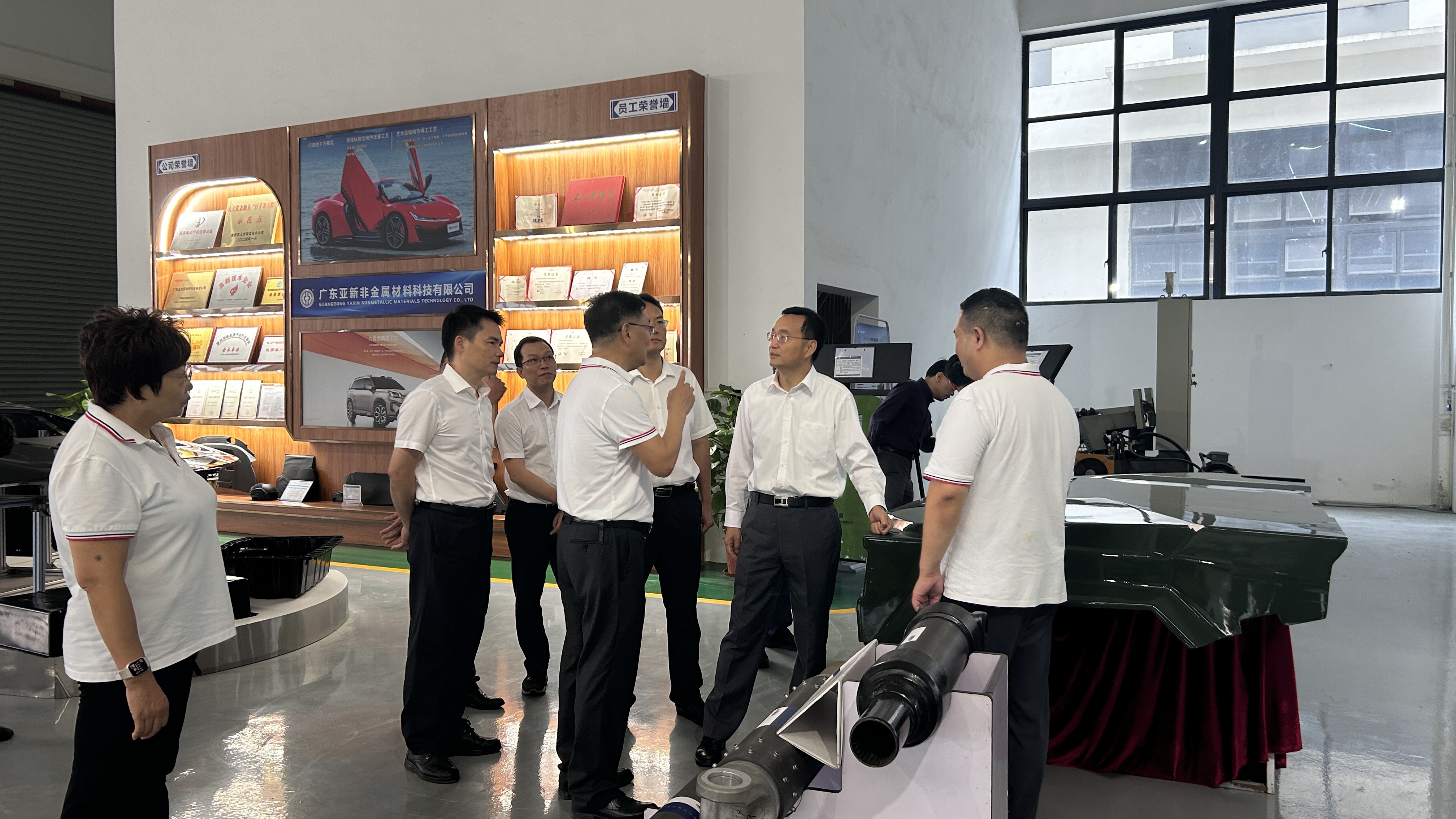 朱增余董事长就落实市委、市政府提出着力打造新能源汽车、新型储能两个千亿产业集群的要求作了专题汇报。在过去几年广东亚太高性能复合材料汽车零部件生产基地借助母公司广东亚太公司与中国工程院陈蕴博院士团队联合研发的复合材料智能化热塑模压生产线,解决了长纤维与树脂融溶技术和快速成型技术,整线智能化达90%,目前已形成年产80万件的生产能力。轻量化、高性能、低成本的LFT-D模压产品已经大规模量产供应给广汽埃安等国内一流主机厂的新车型上。如埃安昊铂GT、HT、AI0N V、RT、UT等主流车型都有亚新非金属高性能复合材料汽车零部件搭载。据了解,包括搭载亚新配套LFT-D底护板产品的车型—广汽埃安首发的AION UT鹦鹉龙等成为了2024年广州车展上主流创新产品。亚太公司还参与了中国第一电动轿跑昊铂SSR的碳纤维车身覆盖部件开发配套供应;部分功能性复合材料产品还给东风猛士、中国北方车辆研究所等单位的特种车型轻量化及功能防护配套,科技团队的技术成果得到快速产业化。