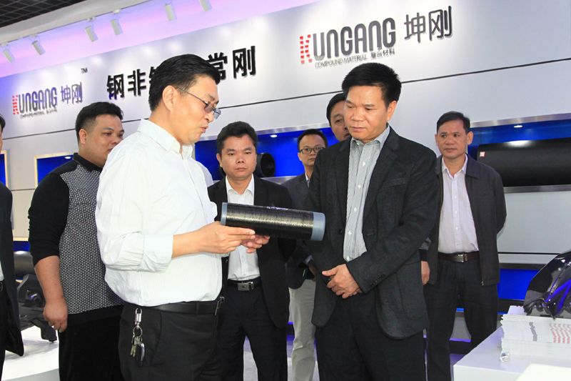 (图为我公司朱总为市委书记袁鹏然、副市长张志雄一行介绍碳纤维复合材料新产品)